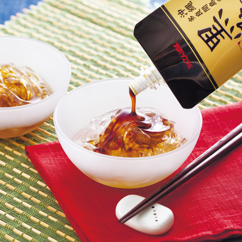 こちらは垂れないように固めてあるのではなくて、沖縄県多良間島産のこだわりの黒糖に特別な寒天を入れてツヤを出し具材に絡みやすくしたのだそうです。