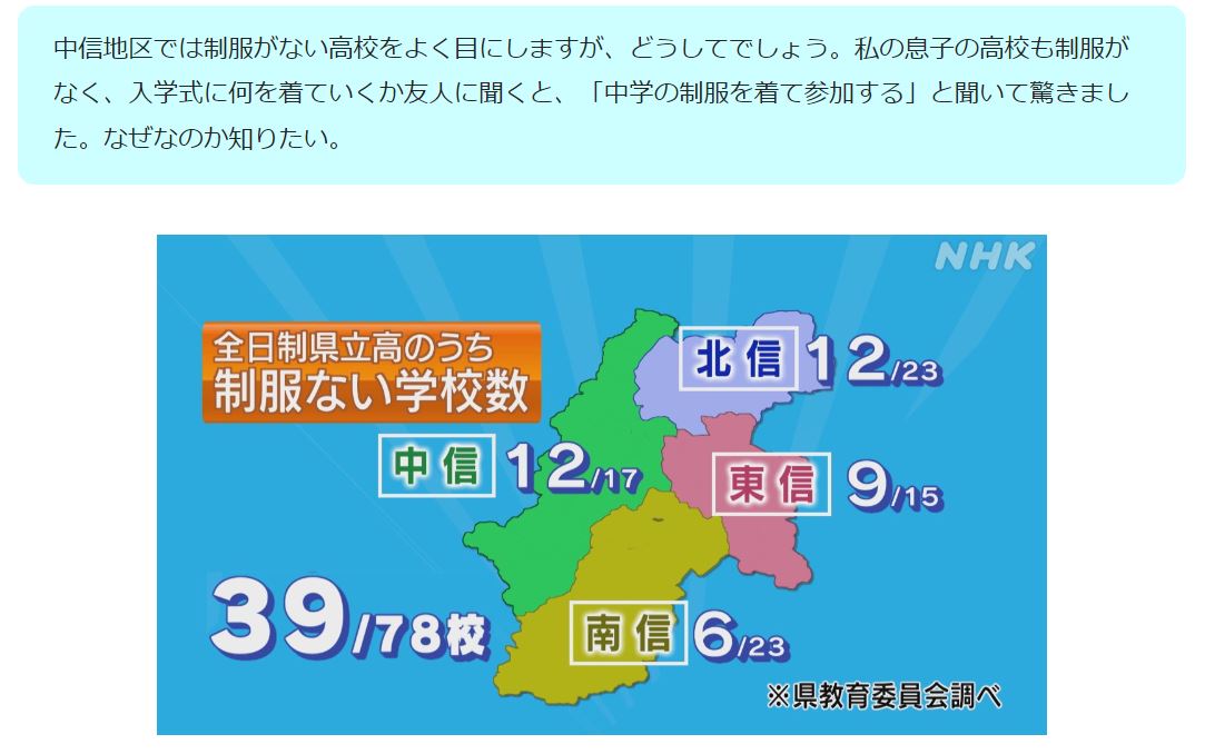長野県内の全日制県立高校のうち、ちょうど半分で制服がないことが分かりました。